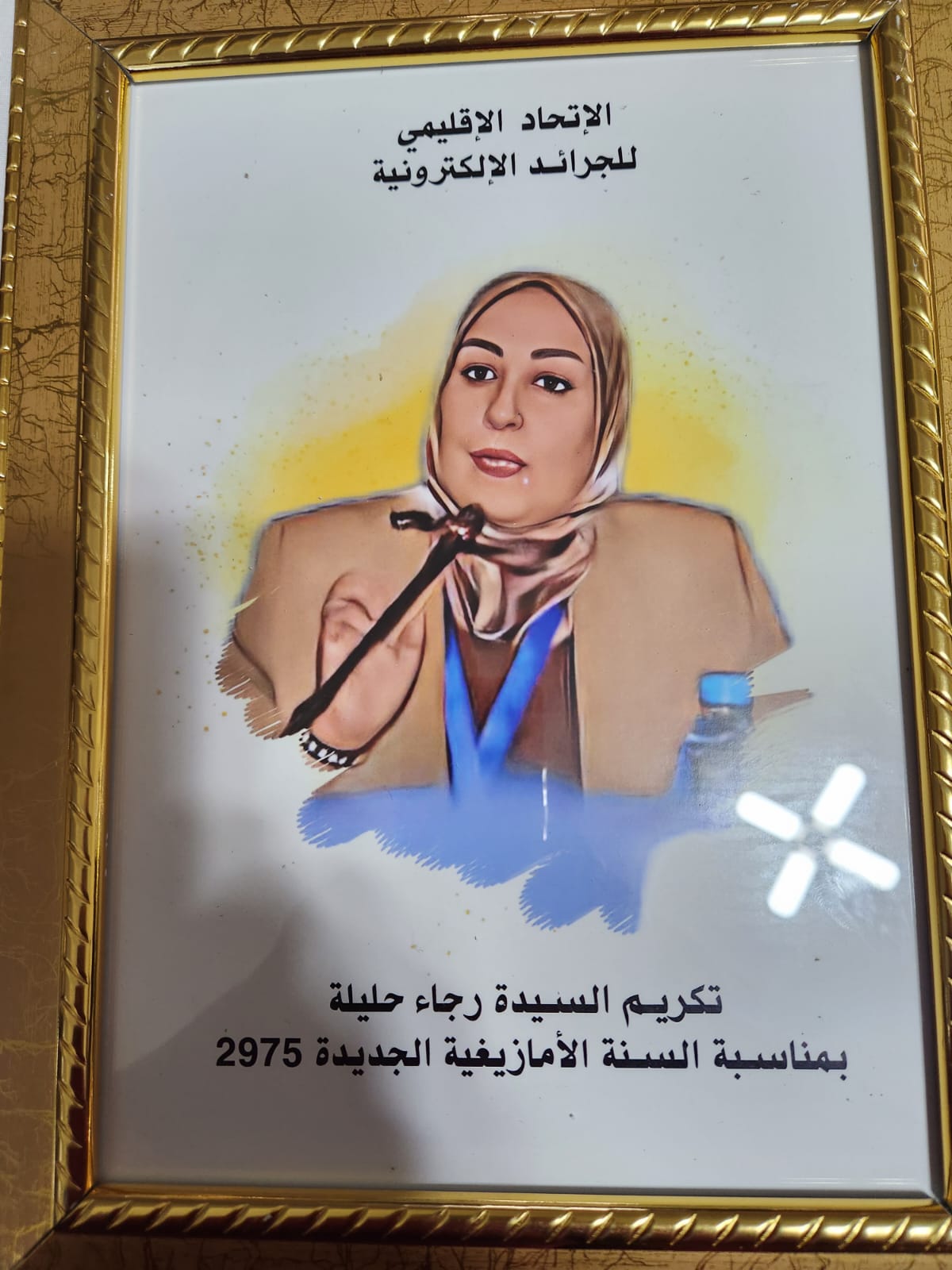 بمناسبة عيد الإستقلال المجيد والسنة الأمازيغية واعترافا بالمجهودات التي تقوم بها السيدة رجاء حليلة المديرة الجهوية لقطاع التواصل والاعلام بجهة سوس ماسة وثتمينا لثمرات جهدها وتعبها كان الفضل لهذه البادرة المحمودة للاتحاد الإقليمي للجرائد الإلكترونية بمدينة تارودانت ، وقد لقت هذه الخطوة
