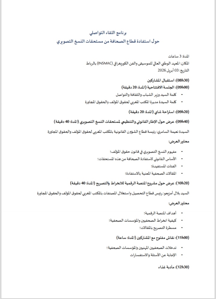 تحتضن وزارة الشباب والثقافة والتواصل، بشراكة مع المكتب المغربي لحقوق المؤلف والحقوق المجاورة، لقاءً تواصليًا مهمًا يسلّط الضوء على سبل استفادة قطاع الصحافة من مستحقات النسخ التصويري، وذلك يوم الجمعة 3 أبريل 2026، بـالمعهد الوطني العالي للموسيقى والفن الكوريغرافي.