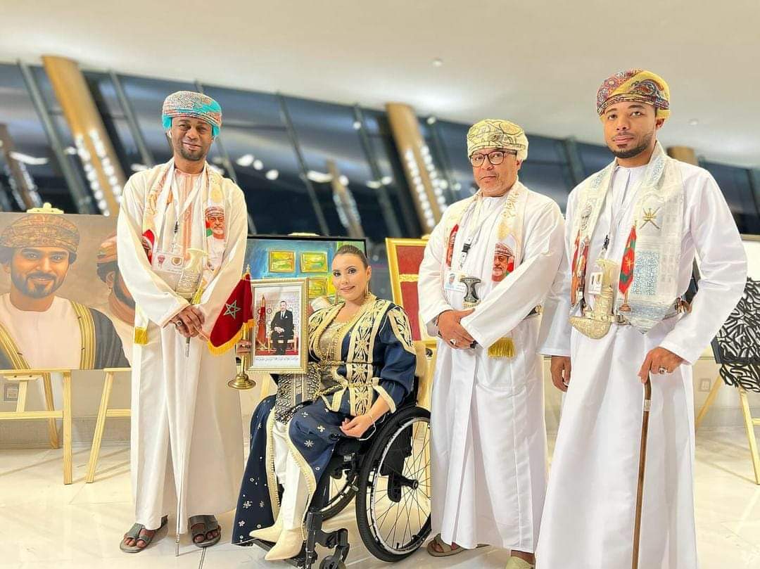 نجاة الباز تعبر عن سرورها بحضورها كضيفة شرف لسلطنة عمان، مؤكدة على بقائها مناضلة وخادمة لوطنها الحبيب. رفعت الراية المغربية بفخر واعتزاز، وأظهرت صورة جلالة الملك محمد السادس.
