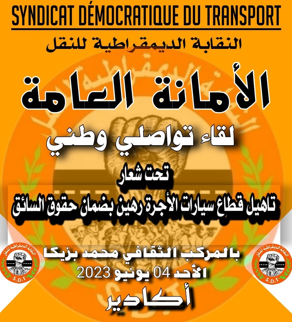 تحت شعار تاهيل قطاع سيارات الأجرة رهين بضمان حقوق السائق وذلك يوم الأحد 04 يونيو 2023 على الساعة الحادية عشرة صباحا بالمركب الثقافي محمد بزيكا بحي المحمدي أكادير
