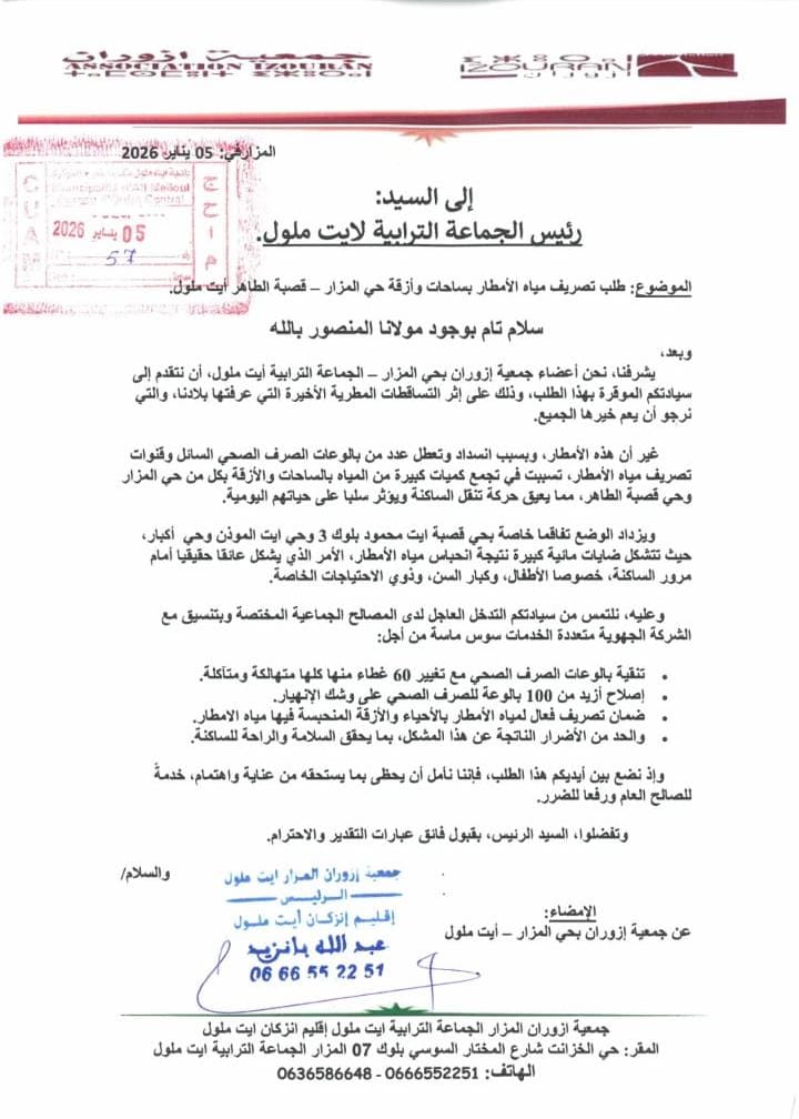 وفي هذا السياق بادرت جمعية ازوران بحي المزار التابعة للجماعة الترابية ايت ملول الى توجيه مراسلة رسمية بتاريخ 05 يناير 2026 الى رئيس الجماعة دقت من خلالها ناقوس الخطر بشأن الوضعية المتدهورة لتصريف مياه الامطار مطالبة بتدخل عاجل وفعال لمعالجة الاشكال بشكل مستدام