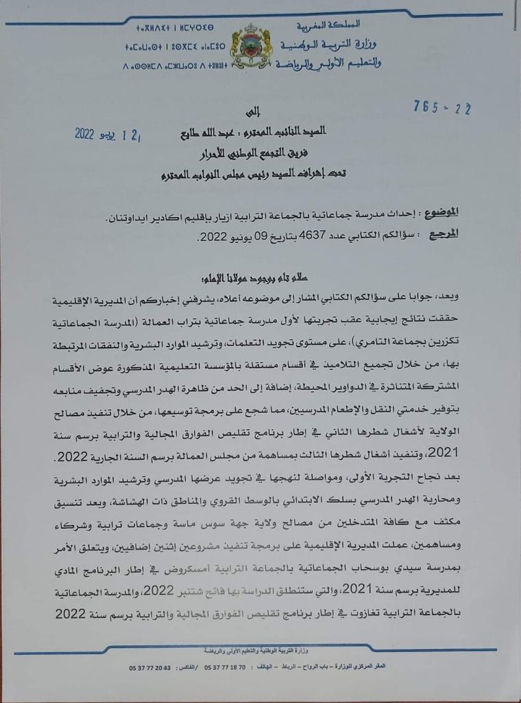 جوابا على سؤال كتابي كان قد وجهه النائب عبد الله طايع عن فريق التجمع الوطني للأحرار، إلى وزير التربية الوطنية والتعليم الأولي والرياضة، بخصوص إحداث مدارس جماعاتية، وهنا يتعلق الأمر بالجماعة الترابية أزيار، تحدث الوزير شكيب بن موسى في مراسلة موجهة إلى النائب عبد الله طايع عن اخر مستجدات الموضوع.