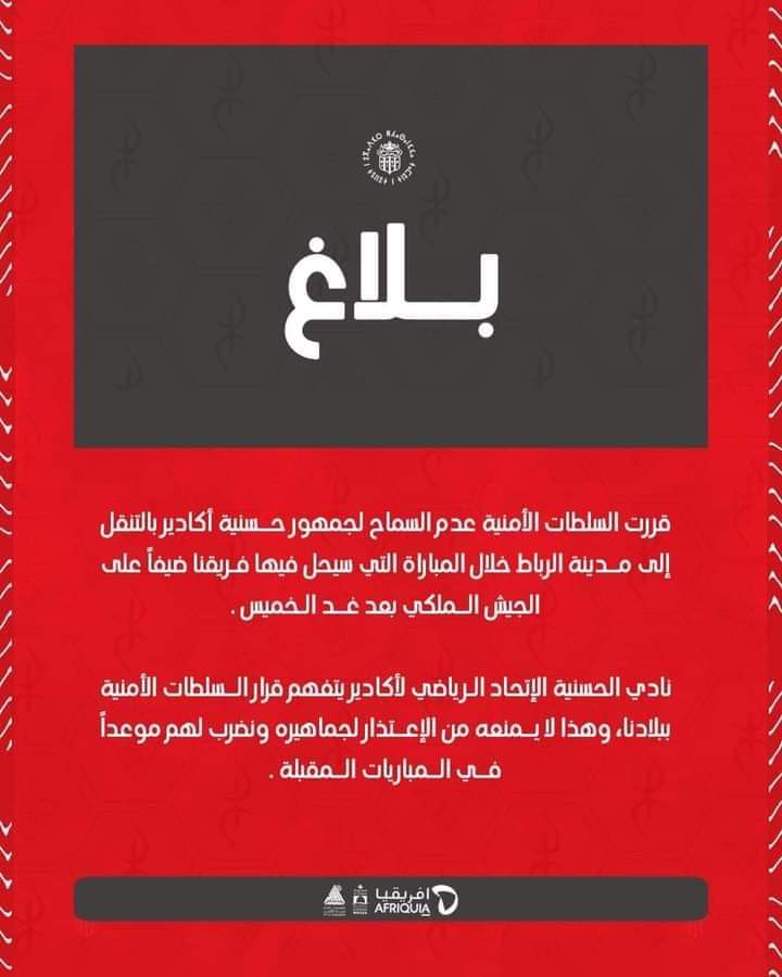 وقد ذكر فريق حسنية أكادير عبر بلاغ نشره في صفحته الرسمية على منصة التواصل الاجتماعي “فيسبوك”، أنه يقدر ويتفهم قرار السلطات الأمنية، معبرا عن اعتذاره لجماهيره، ويضرب لهم موعدا في المباريات القادمة.