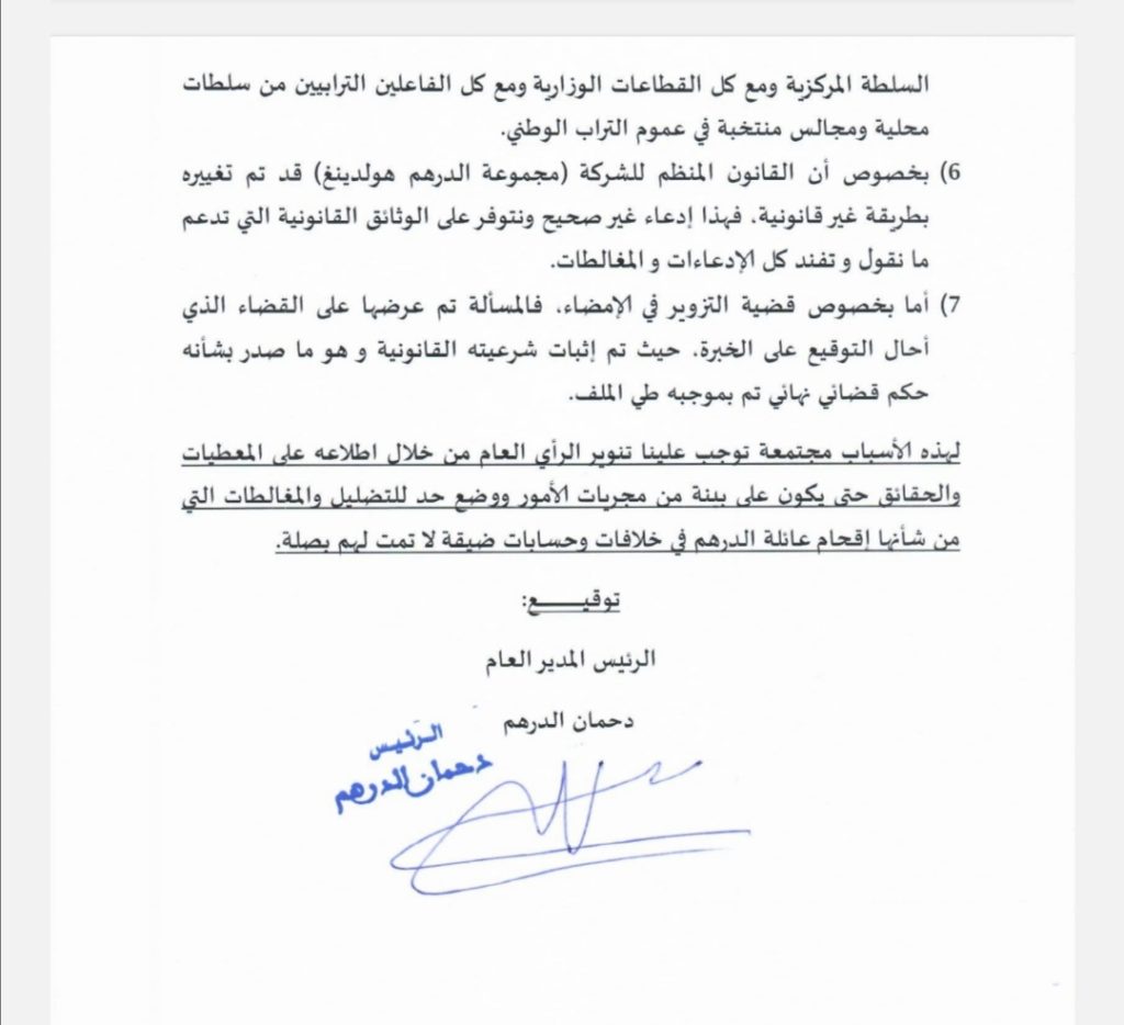 مؤكدا حصر الهولدينغ ع الدائم على أواصر الأخوة تعزيزا لمكانة وعزة العائلة. وبالمقابل إدانته الشديدة لما ورد في الحوار الصحفي لحسن الدرهم من مغالطات وتحريف وتطاول على الحقائق و المعطيات التي قد تنحو نحو إثارة الفتن ما بين أبناء البيت الواحد والذرية الواحدة.